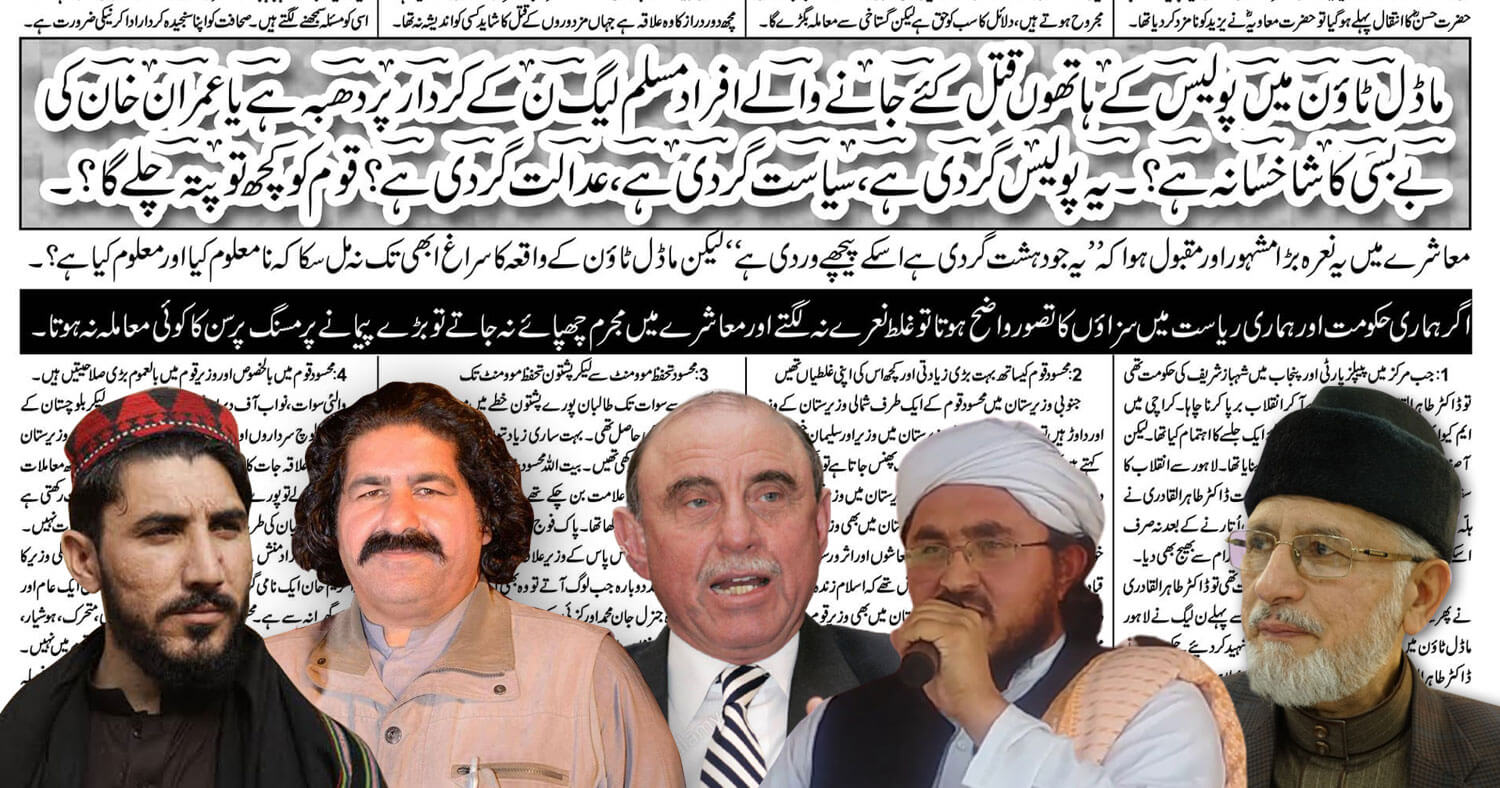 نمبر….4 …… ماڈل ٹاؤن میں پولیس کے ہاتھوں قتل کئے جانے والے افراد مسلم لیگ ن کے کردار پر دھبہ ہے یا عمران خان کی بے بسی کا شاخسانہ ہے؟۔ یہ پولیس گردی ہے، سیاست گردی ہے ، عدالت گردی ہے؟قوم کو کچھ تو پتہ چلے گا؟۔ معاشرے میں یہ نعرہ بڑامشہور اور مقبول ہوا کہ ”یہ جو دہشت گردی ہے اسکے پیچھے وردی ہے” لیکن ماڈل ٹاؤن کے واقعہ کا سراغ ابھی تک نہ مل سکا کہ نامعلوم کیا اور معلوم کیا ہے؟۔ اگر ہماری حکومت اور ہماری ریاست میں سزاؤں کا تصور واضح ہوتا تو غلط نعرے نہ لگتے اور معاشرے میں مجرم چھپائے نہ جاتے تو بڑے پیمانے پرمسنگ پرسن کا کوئی معاملہ نہ ہوتا۔