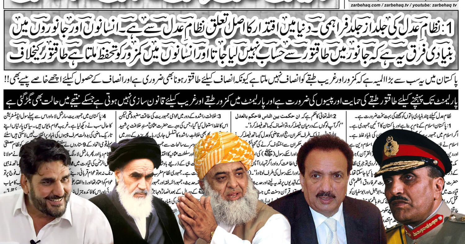 (2) اللہ تعالیٰ کا حکم ہے کہ ان حکمت بین الناس فاحکم بالعدل ”اگر آپ لوگوں کے درمیان فیصلہ کرو، تو انصاف کیساتھ فیصلہ کرو”۔ اللہ تعالیٰ نے ایک طرف حکمران ، جج اور قاضی کو عدل کیساتھ فیصلہ کرنے کا حکم دیا ہے تو دوسری طرف حکمران سے اختلاف کرنے کی گنجائش بھی رکھی ہے۔ فرمایا:” اللہ کی اطاعت کرو اور اسکے رسول (ۖ) کی اطاعت کرو اور تم میں سے جو اولی الامر ہو ،اس کی اطاعت کرو اور اگر تمہارا آپس میں کسی چیز پر اختلاف ہوجائے تو اس کو اللہ اور اسکے رسول کی طرف لوٹادو”۔ (القرآن) حضرت عمر نے غزوہ بدر کے قیدیوں پر فدیہ لینے اور حدیث قرطاس میں رسول اللہۖ سے اختلاف کیا تھا۔ قرآن وسنت میں جب رسول اللہۖ اولی الامر تھے تو بعض معاملات میں صحابہ کرام نے اولی الامر کی حیثیت سے رسول اللہۖ سے اختلاف کیا ہے۔ سنی مکتبۂ فکر کا اسلام جمہوری ہے اسلئے پاکستان میں جمہوری انقلاب کی ضرورت ہے۔ حضرت ابوبکر ، حضرت عمر اور حضرت عثمان کے بعد جن لوگوں نے اپنی تائید سے ان تین خلفاء راشدین کو منتخب کیا تھا ، انہوں نے حضرت علی کو بھی منتخب کیا تھا۔ نہج البلاغہ میں حضرت علی نے خود بھی اپنے لئے یہ حوالہ دیا ہے۔ ایران میں انقلاب کے ذریعے ہی سے بادشاہت ختم ہوگئی لیکن پھر جمہوری نظام ہی کو بعد میں اختیار کیا گیا۔