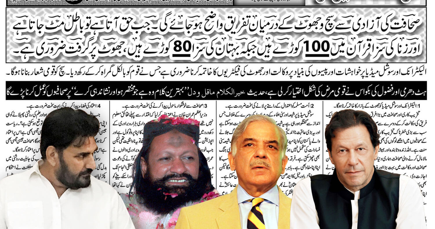 نمبر….3 …… صحافت کی آزادی سے سچ و جھوٹ کے درمیان تفریق واضح ہوجائے گی۔ جب حق آتا ہے تو باطل مٹ جاتاہے اور زنا کی سزا قرآن میںسو(100)کوڑے ہیں جبکہ بہتان کی سزا اسی (80)کوڑے ہیں،جھوٹ پر گرفت ضروری ہے۔ الیکٹرانک اور سوشل میڈیا پر خواہشات اور پیسوں کی بنیاد پروکالت اورجھوٹ کی فیکٹریوں کا خاتمہ کرنا ضروری ہے جس نے قوم کو بالکل گمراہ کرکے رکھ دیا۔سچ کو قومی شعار بنانا ہوگا۔ ہٹ دھرمی اور فضول کی بکواس نے قومی مرض کی شکل اختیار کرلی ہے، حدیث خیرالکلام ماقل ودل ”بہترین کلام وہ ہے جو مختصر ہو اور نشاندہی کرے” پر صحافیوں کو عمل کرنا پڑے گا