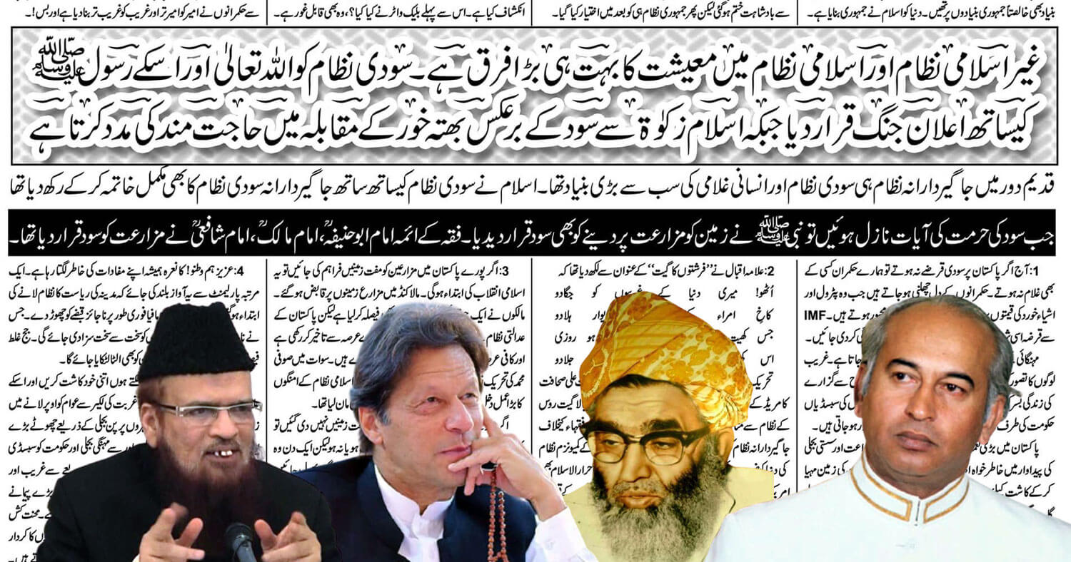نمبر….2 …… غیر اسلامی نظام اور اسلامی نظام میں معیشت کا بہت ہی بڑا فرق ہے۔ سودی نظام کو اللہ تعالیٰ اور اسکے رسولۖ کیساتھ اعلان جنگ قرار دیا جبکہ اسلام زکوٰة سے سود کے برعکس بھتہ خورکے مقابلہ میں حاجت مند کی مدد کرتاہے قدیم دور میں جاگیردارانہ نظام ہی سودی نظام اور انسانی غلامی کی سب سے بڑی بنیاد تھا۔ اسلام نے سودی نظام کیساتھ ساتھ جاگیردارانہ سودی نظام کا بھی مکمل خاتمہ کرکے رکھ دیاتھا جب سود کی حرمت کی آیات نازل ہوئیں تو نبیۖ نے زمین کو مزارعت پر دینے کو بھی سود قرار دیدیا۔ فقہ کے ائمہ امام ابوحنیفہ، امام مالک ،امام شافعی نے مزارعت کوسود قرار دیا تھا۔