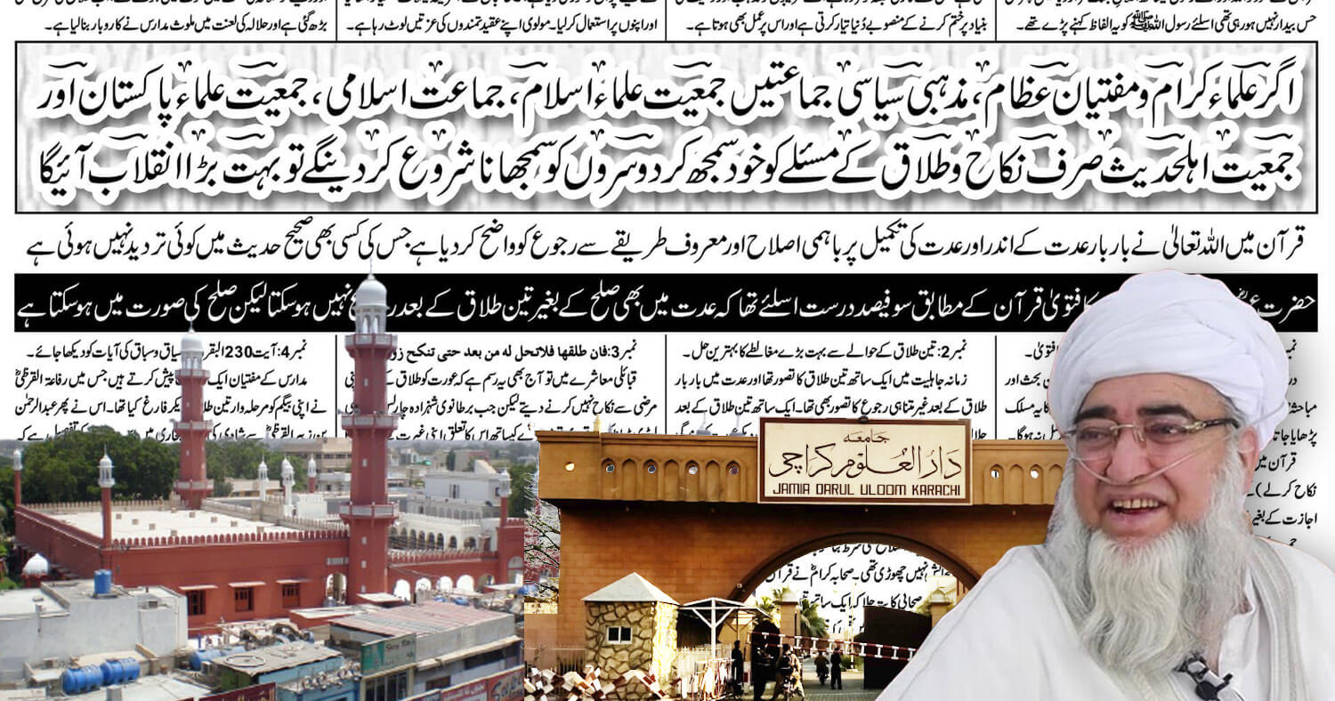 نمبر….6 …… اگر علماء کرام ومفتیان عظام ، مذہبی سیاسی جماعتیںجمعیت علماء اسلام، جماعت اسلامی، جمعیت علماء پاکستان اور جمعیت اہلحدیث صرف نکاح و طلاق کے مسئلے کو خود سمجھ کر دوسروں کو سمجھانا شروع کردینگے تو بہت بڑا انقلاب آئیگا قرآن میں اللہ تعالیٰ نے بار بار عدت کے اندر اور عدت کی تکمیل پر باہمی اصلاح اور معروف طریقے سے رجوع کو واضح کردیا ہے جس کی کسی بھی صحیح حدیث میں کوئی تردید نہیں ہوئی ہے حضرت عمر کا فیصلہ اور ائمہ اربعہ کا فتویٰ قرآن کے مطابق سوفیصد درست اسلئے تھا کہ عدت میں بھی صلح کے بغیر تین طلاق کے بعد رجوع نہیں ہوسکتا لیکن صلح کی صورت میں ہوسکتاہے