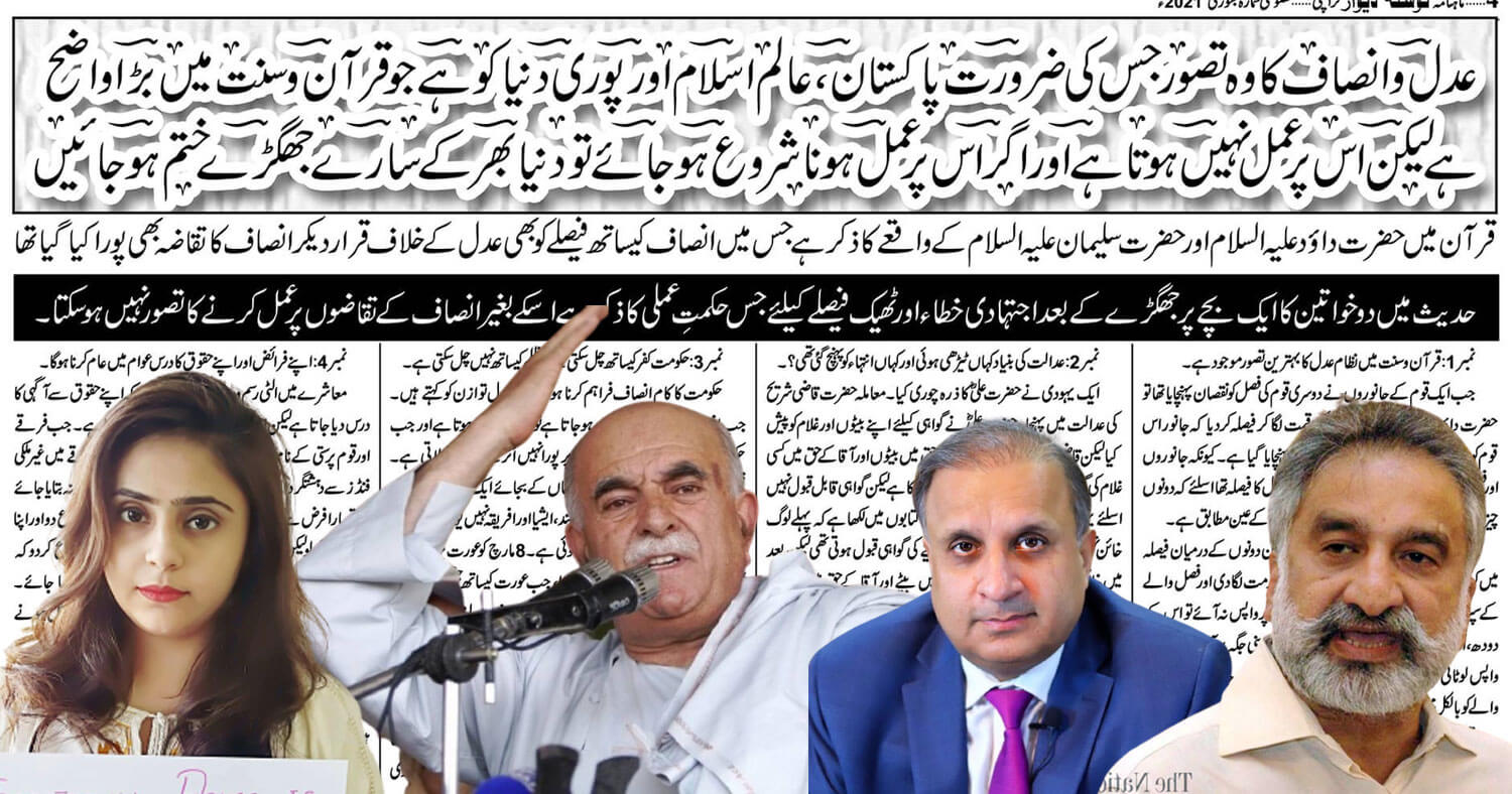 نمبر….7 …… عدل وانصاف کا وہ تصور جس کی ضرورت پاکستان ، عالم اسلام اور پوری دنیا کو ہے جو قرآن وسنت میں بڑا واضح ہے لیکن اس پر عمل نہیں ہوتا ہے اور اگر اس پر عمل ہونا شروع ہوجائے تو دنیا بھر کے سارے جھگڑے ختم ہوجائیں قرآن میں حضرت داؤد علیہ السلام اور حضرت سلیمان علیہ السلام کے واقعے کا ذکر ہے جس میں انصاف کیساتھ فیصلے کو بھی عدل کے خلاف قرار دیکر انصاف کاتقاضہ بھی پورا کیا گیا تھا حدیث میں دو خواتین کا ایک بچے پر جھگڑے کے بعد اجتہادی خطاء اور ٹھیک فیصلے کیلئے جس حکمتِ عملی کا ذکر ہے اسکے بغیر انصاف کے تقاضوں پر عمل کرنے کا تصور نہیں ہوسکتا۔