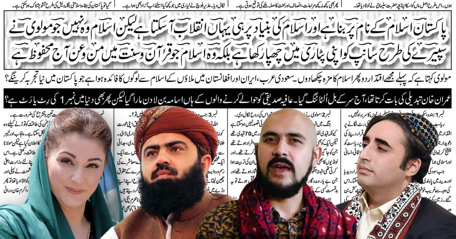 نمبر….8 …… پاکستان اسلام کے نام پر بناہے اور اسلام کی بنیاد پر ہی یہاں انقلاب آسکتا ہے لیکن اسلام وہ نہیں جو مولوی نے سپیرے کی طرح سانپ کو اپنی پٹاری میں چھپارکھا ہے بلکہ وہ اسلام جو قرآن وسنت میں من وعن آج محفوظ ہے مولوی کہتا ہے کہ پہلے مجھے اقتدار دو پھر اسلام کا مزہ چکھا دوں ۔ سعودی عرب، ایران اور افغانستان میں ملاؤں کے اسلام سے لوگوں کا فائدہ ہواہے جو پاکستان میں نیا تجربہ کرینگے؟ عمران خان تبدیلی کی بات کرتا تھا،آج سرکے بل اُلٹا ٹنگ گیا۔عافیہ صدیقی کو حوالے کرنے والوں کے ہاں اسامہ بن لادن مارا گیا لیکن پھر بھی دنیا میں نمبرایک کی رِٹ یارَٹ ہے؟